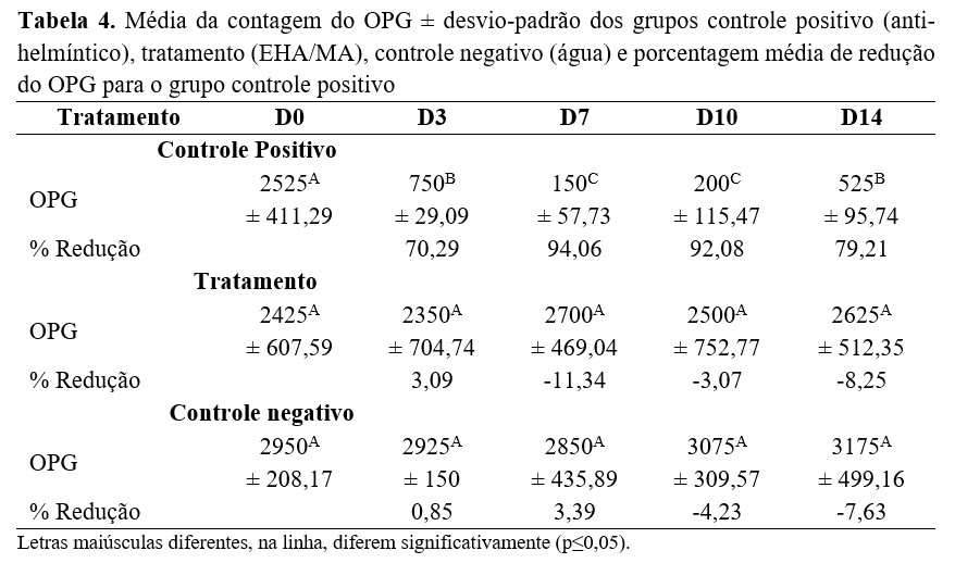 Foram utilizados 24 ovinos da raça corriedale, com 8 a 10 meses de idade, de ambos os sexos, naturalmente infectados por nematódeos gastrintestinais e divididos em grupos de oito animais cada um. Os animais estavam no mínimo há 60 dias sem receber tratamento anti-helmíntico e foram distribuídos homogeneamente nos grupos conforme a carga parasitária estimada pela contagem de OPG. Durante o período experimental, os animais permaneceram em pastagem nativa recebendo água ad libitum. O grupo controle positivo recebeu anti-helmíntico comercial (moxidectina, via subcutânea, 0,2 mg/kg) e o controle negativo água. Para o grupo tratamento, o extrato hidroalcoólico por maceração de E. uniflora (EHA/MA) na concentração de 100 mg/Kg foi administrado diariamente, por via oral, durante três dias consecutivos. Para avaliar a eficácia do tratamento, foi realizada a coleta individual de fezes diretamente da ampola retal nos dias 0, 3, 7, 10 e 14 após o início do tratamento para a contagem de OPG e coprocultura. Para a determinação do percentual de redução do OPG, utilizou-se a fórmula descrita por Coles(19): % Redução = (1 – [Dia pós tratamento/Dia zero]100.