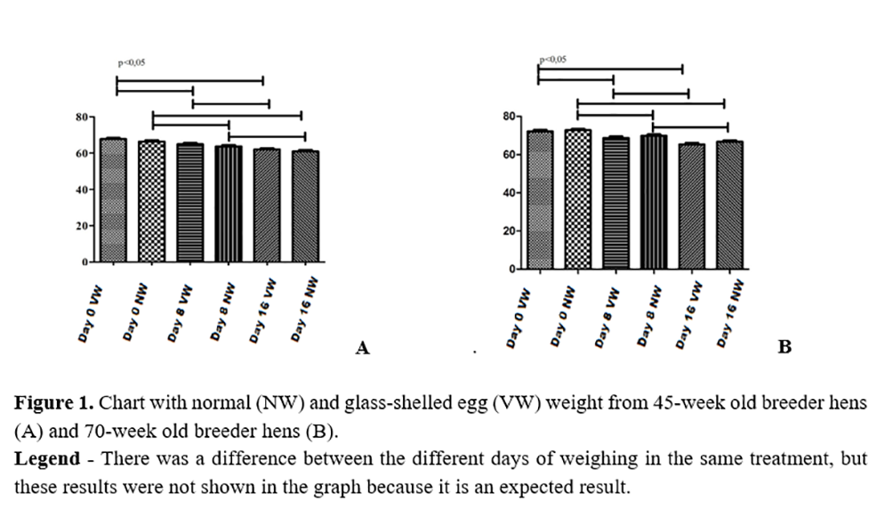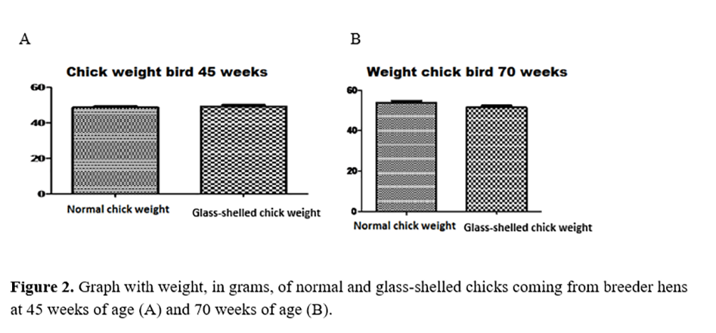 The results found for hatch weight of the chicks are shown in Figures 2A and 2B. For both chicks from 45- and 70-week-old breeder hens, the weights of normal chicks did not present statistical difference when compared to glass-shelled chicks.