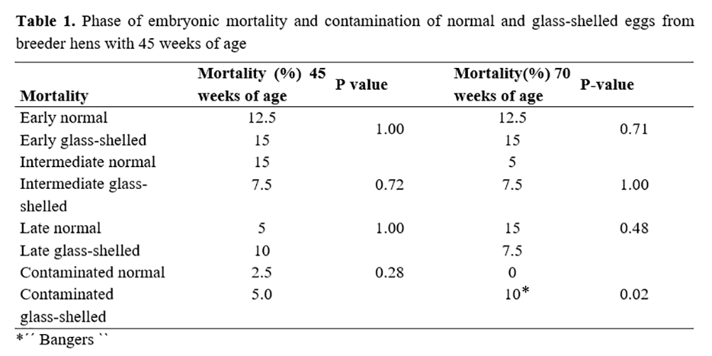The results of this work show no interference in the embryonic viability or quality of chicks from glass-shelled eggs of heavy breeder hens at 45 and 70 weeks of ages in the studied breed. However, there is increased contamination of glass-shelled eggs from 70-week old hens.