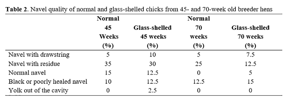 The findings related to nail quality of normal and glass-shelled 1-day chicks from 45- and 70-week old breeder hens are shown in Table 2.
