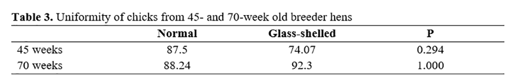 No statistical differences were observed between normal and glass-shelled chicks at both ages for uniformity (Table 3).