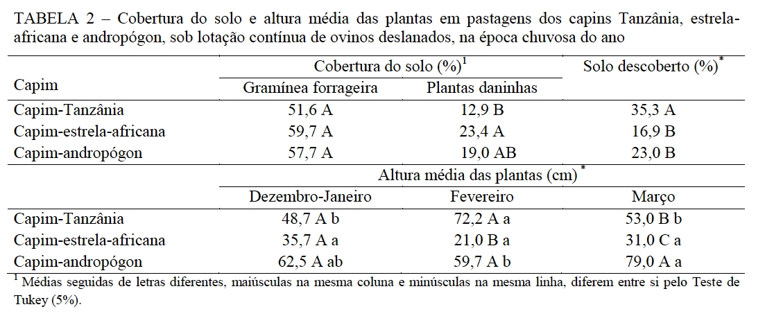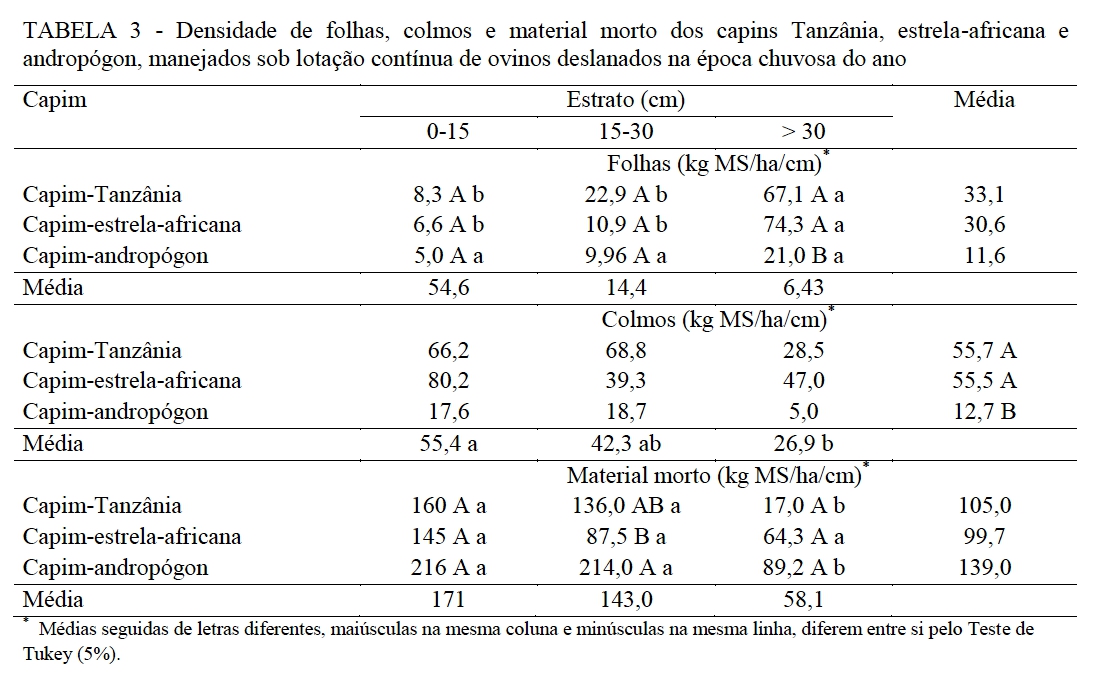 espécies de gramíneas forrageiras (capins Tanzânia, estrela-africana e andropógon), manejadas sob lotação