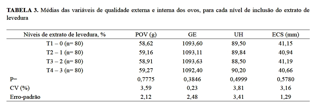 Os parâmetros de qualidade externa e interna dos ovos, POV, GE, ACL, ECS e UH, apresentados na Tabela 3,