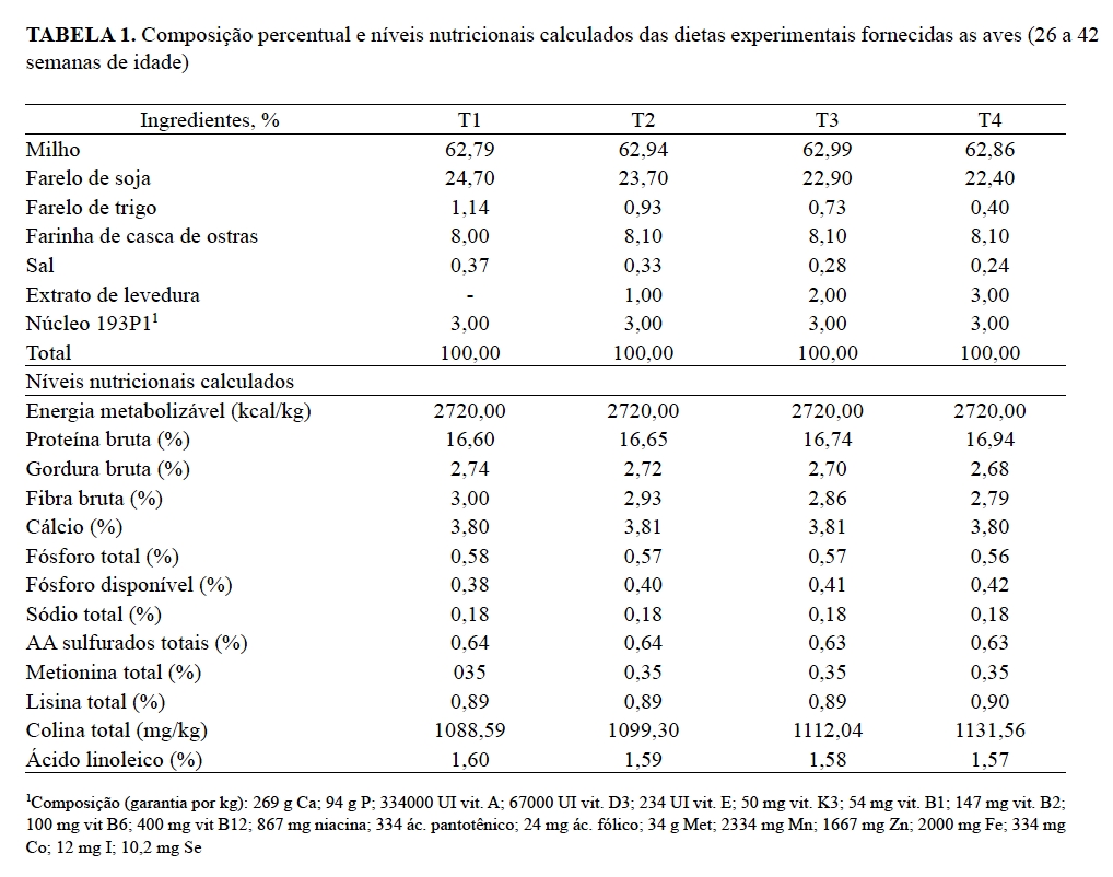 DESEMPENHO PRODUTIVO E QUALIDADE DE OVOS DE POEDEIRAS SEMIPESADAS COM ADIÇÃO DE EXTRATO DE LEVEDURAS NA DIETA