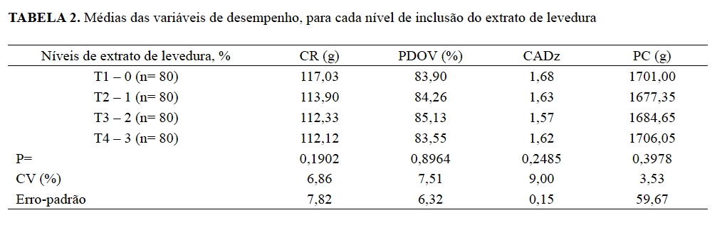 Os dados de desempenho produtivo apresentados na Tabela 2