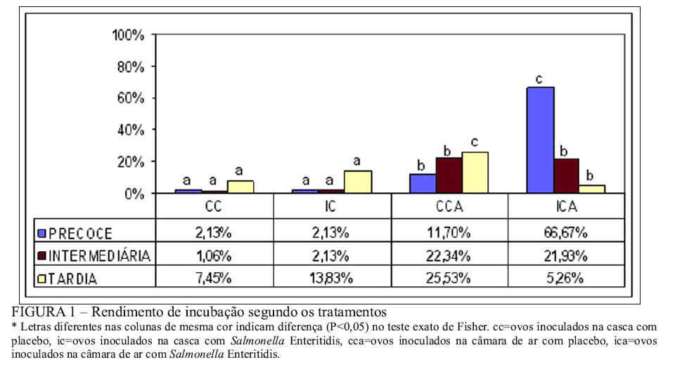Salmonella Enteritidis foi inoculada via casca e via câmara de ar, respectivamente. A colonização intestinal positiva para