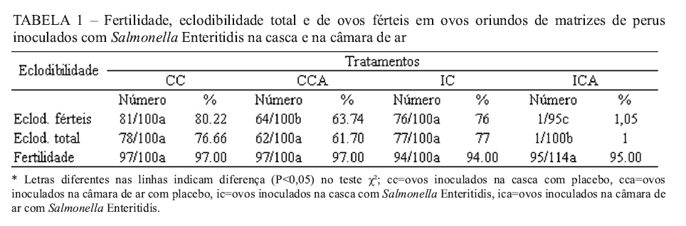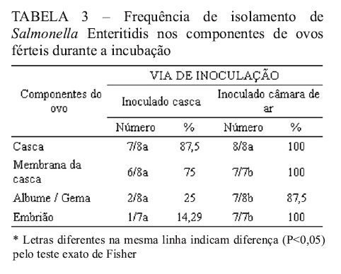BARROS, M. R.; ANDREATTI FILHO, R. L.; LIMA, E. T.; SAMPAIO, H. M.; CROCCI, A. J. Sobrevivência de Salmonella Enteritidis em ovos contaminados artificialmente, após desinfecção e armazenados em diferentes temperaturas. Revista Brasileira de Ciência Avícola, v. 3, n. 3., p.219-223, 2001.