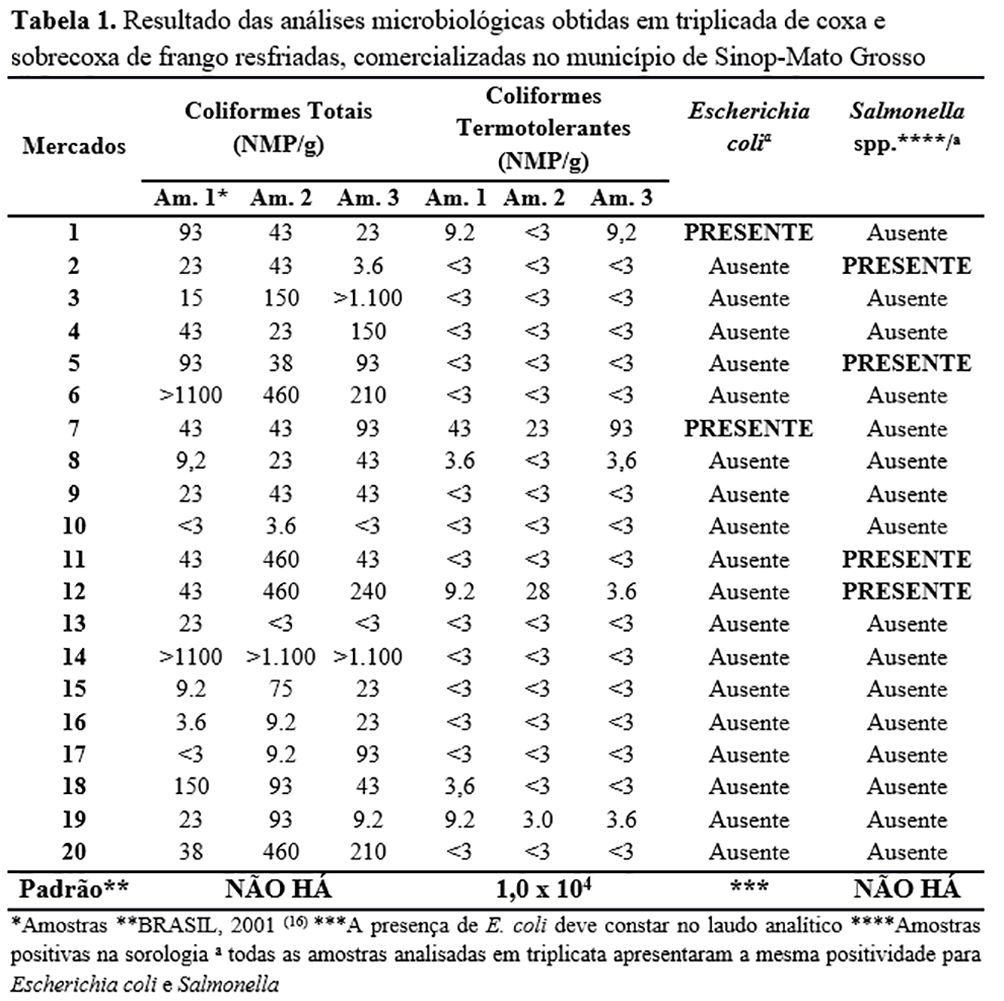 Para a realização desta pesquisa, foram adquiridas 60 amostras, contendo no mínimo 200 gramas, de coxa e sobrecoxa unidas e resfriadas, obtidas de frangos industriais e vendidas a granel em estabelecimentos comerciais no período de outubro de 2014 a abril de 2015. As amostras foram adquiridas em 20 estabelecimentos comerciais no município de Sinop – Mato Grosso, coletando-se simultaneamente três amostras embaladas separadamente no próprio estabelecimento comercial. Os exemplares foram acondicionados em caixa isotérmica com gelo reciclável e transportados ao Laboratório de Microbiologia Veterinária do Campus Universitário de Sinop para a realização de análises microbiológicas compostas por: enumeração de coliformes totais, coliformes termotolerantes, Escherichia coli e pesquisa de Salmonella spp. (8,9).