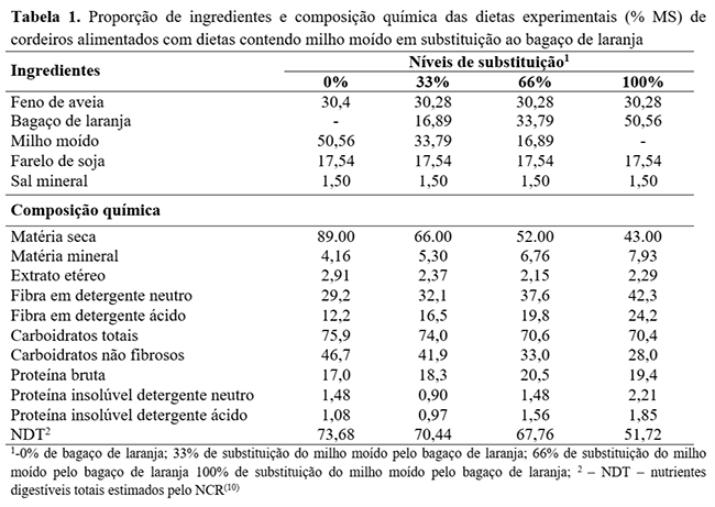 Foram utilizados 32 machos inteiros, mestiços da raça Texel (7/8), com peso médio inicial de 16 ± 2,5 kg. Os animais foram distribuídos em delineamento inteiramente casualizado em quatro tratamentos experimentais, com oito repetições. Os tratamentos foram quatro níveis de substituição (0%, 33%, 66% e 100%) do farelo de milho pelo bagaço de laranja, na matéria seca da dieta. O bagaço de laranja foi adquirido da Cooperativa de Cafeicultores de Maringá Ltda (COCAMAR), produtora de suco de laranja situada na cidade de Rolândia ̶ PR.