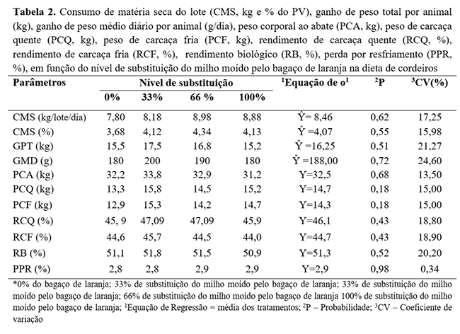 O consumo de matéria seca (Tabela 2) do lote não se alterou com os níveis de bagaço de laranja nas dietas e apresentou valor médio de 8,46 kg de matéria seca por lote por dia (p>0,05), o que representaria, em média, 1 kg de matéria seca por animal e, em média, 4,07% do peso vivo. Esses dados indicam que não houve limitação de consumo, mesmo no maior nível de substituição (100%), em que o bagaço representou 50% (Tabela 1) da matéria seca da dieta. Seguindo a mesma tendência, os resultados em desempenho (peso corporal ao abate, ganho de peso médio diário e ganho de peso total) foram semelhantes entre os tratamentos, apresentando valores médios de 32,5 kg, 188 g e 16,25 kg, respectivamente. A semelhança entre os resultados de desempenho obtidos entre as dietas contendo porções de bagaço de laranja pode estar relacionada à semelhança em velocidade de digestão e também à semelhança em aceitação pelos animais, não provocando, dessa forma, prejuízo algum ao desempenho animal.