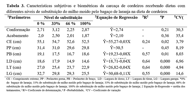 A inclusão do bagaço de laranja não alterou as variáveis para desempenho e quantitativas da carcaça (Tabela 2). As características de conformação e acabamento de carcaça (Tabela 3), que são variáveis subjetivas, foram semelhantes entre as diferentes dietas (p>0,05). As características biométricas da carcaça apresentaram comportamento linear negativo (p<0,05) em função da substituição do milho pelo bagaço de laranja, diminuindo os valores com o aumento da proporção de bagaço na dieta.