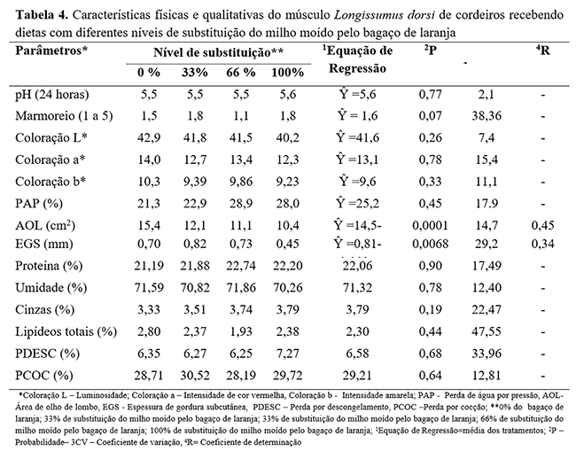 Os parâmetros avaliados na carne (Tabela 4) não apresentaram diferenças significativas (p>0,05), exceto a área de olho de lombo e a espessura de gordura subcutânea, que reduziram seus valores com os incrementos nos níveis de substituição do milho pelo bagaço de laranja (p<0,05).