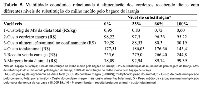 Para o cálculo da viabilidade econômica do uso do bagaço de laranja, consideraram-se os custos das dietas utilizadas, o custo de aquisição do cordeiro magro e a receita da carcaça. O custo individual por kg de matéria seca de cada tratamento foi 0,95; 0,83; 0,72 e 0,60 R$ para as dietas 0%, 33%, 66% e 100%, respectivamente. O preço de aquisição do cordeiro magro foi de. O custo total por animal foi a soma do custo de alimentação por animal (em todo o período) e o valor de aquisição do cordeiro magro (R$ 6,00 por kg de peso vivo). A receita de carcaça foi o produto da média peso de carcaça e o preço de venda da carcaça por quilo (R$ 18,00).