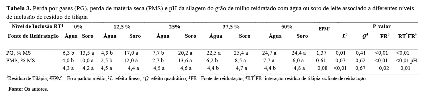 A maior concentração de PB e EE na silagem reidratada com soro de leite com o aumento do nível de inclusão do resíduo de tilápia provavelmente está atribuída ao maior teor de PB e EE presente na composição do soro (Tabela 2), associado ao teor de PB e EE do resíduo de tilápia (tabela 1). Segundo Ramos et al.(30), os lipídios provenientes da silagem de resíduo de tilápia podem reduzir a excessiva solubilização da proteína no material, contudo, a presença de óleo juntamente aos altos níveis de ácidos graxos poli-insaturados, que estão sujeitos à oxidação, pode tornar a silagem não palatável e imprópria ao consumo do animal. Além disso, altas concentrações de PB prejudicam a conservação da silagem devido à alta concentração de amônia no material e alteração da capacidade de tamponamento(19).