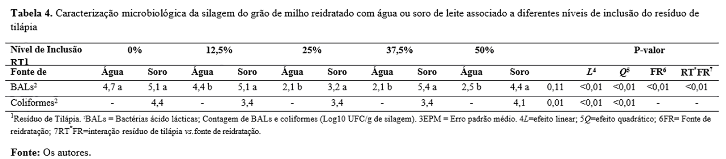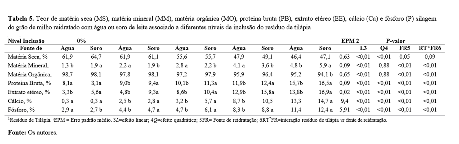 A silagem de grão de milho reidratado (com água ou soro de leite) associado ao resíduo de tilápia, devido às suas características, mostrou ser um produto com alto valor proteico e energético, bem como fonte de Ca e P com até 25% de inclusão do resíduo. Entretanto, o seu uso está condicionado às avaliações do melhor nível de inclusão na dieta para promover melhor desempenho dentro de uma categoria animal e fase fisiológica específica. É importante se atentar ao uso de soro de leite quanto à composição microbiológica, visto que seu uso possibilita alteração na qualidade da silagem.