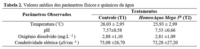 As médias dos parâmetros físicos e químicos da qualidade da água durante todo o período experimental estão apresentadas na Tabela 2. Os valores mantiveram-se estáveis durante o experimento não apresentando diferença significativa entre os tratamentos (p>0,05).