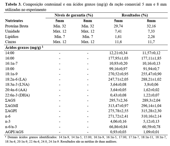 Os resultados das análises da composição de ácidos graxos das duas rações utilizadas neste experimento demonstram os baixos teores do ácido graxo 18:3n-3 (LNA), sendo 3,64 mg/g e 3,9 mg/g para as rações de 5 mm e 8 mm respectivamente. Nestas mesmas rações foram encontrados elevados teores do ácido graxo 18:2n-6 (LA), sendo 247,71 mg/g totais na ração de 5 mm e 288,21 mg/g na ração de 8 mm. Desta maneira a razão n-6/n-3 apresentou-se muito elevada. Segundo o Departament of Health and Social Security(16), o valor da razão n-6/n-3 deve ser de no máximo quatro em alimentos para humanos. O ácido graxo LNA, de elevada importância nutricional, é essencial e precursor de outros ácidos graxos da família ômega-3. O LA também é essencial e precursor de outros ácidos graxos da família ômega-6, e é comumente encontrado em óleos vegetais como o de soja, milho e girassol. Por não serem sintetizados pelo organismo humano e animal, os ácidos graxos essenciais são imprescindíveis nas dietas, portanto a composição em ácidos graxos da ração fornecida determinará a composição em ácidos graxos dos lipídios totais dos peixes(17).