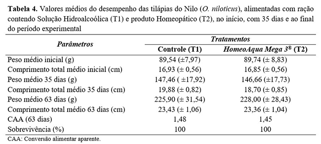 Para tilápias do Nilo, a utilização de produtos homeopáticos (Homeopatila 100®, Homeopatila RS® e HomeoAqua Mega 3®) na dieta (40 mL kg-1 de ração) melhorou a sobrevivência dos alevinos, reduziu a inclusão lipídica hepática, o índice hepatossomático e o teor de lipídios totais no tecido muscular(6, 7, 8).