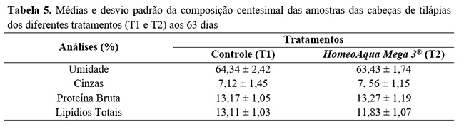 Os valores médios das análises de umidade, cinzas, proteína bruta e lipídios totais das amostras de cabeça de tilápia do Nilo, dos tratamentos T1 e T2, estão descritos na Tabela 5. Os resultados de todas as análises não apresentaram diferença significativa entre os tratamentos (p>0,05).