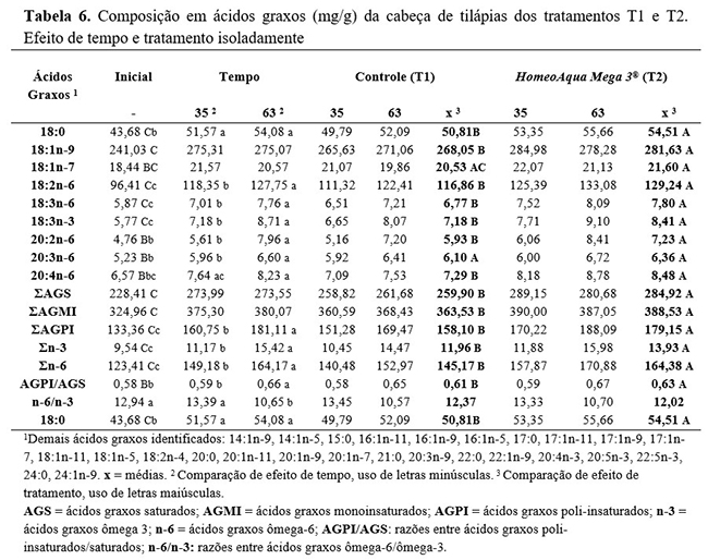 Na Tabela 6 são apresentadas as concentrações dos ácidos graxos em mg/g das cabeças das tilápias dos tratamentos T1 e T2 que, após a análise estatística, apresentaram efeito de tempo e tratamento isoladamente.