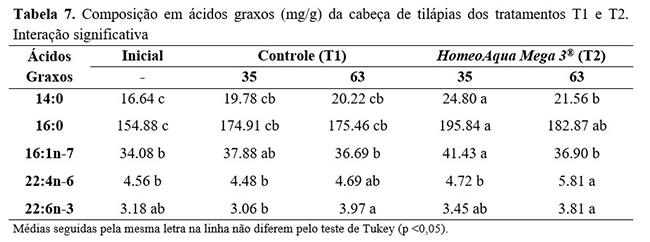 As cabeças das tilápias analisadas são uma excelente fonte calórica devido ao elevado teor de lipídios totais. As tilápias do Nilo que receberam a ração com o HomeoAqua Mega-3® (40 mL kg-1) apresentaram a razão AGPI/AGS superior ao do tratamento controle, não alterando o desempenho dos animais durante o período experimental.