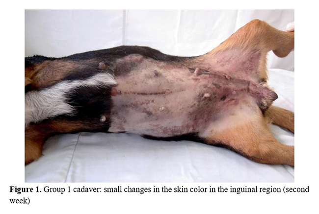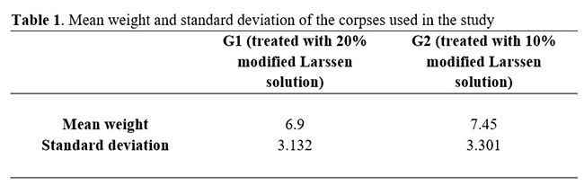 There was no significant difference in cadaver preservation with 20% and 10% Larssen solution (p > 0.05). All cadavers remained in a good state of preservation over the course of the experimental period. Mild skin changes did not interfere with surgical procedures (Figures 1 and 2). One cadaver from the G1 group developed incipient putrefaction in the second week, but did not undergo further deterioration over the next two weeks. Incipient putrefaction was noted in two cadavers of the G2 group in the last week of the experimental period (Table 4).