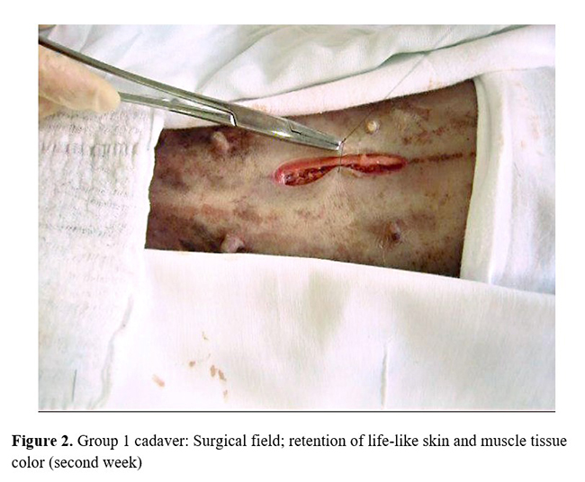 Hygiene procedures were paramount to minimize odor development and remove debris. As proposed in this study, repeated washing with neutral soap and shampoo following embalming and prior to use is highly recommended. Formulation-specific preservation protocols must be strictly followed, because changes could compromise the outcomes.Successful surgical skill trainings with animal cadavers obtained from veterinary hospitals and animal shelters have been reported(5). The use of cadavers has several advantages, including high anatomical fidelity and faithful simulation of real-life situations(6). Cadavers are amenable to repeated use. Therefore, all students have a chance to perform most of the procedures(7). On the other hand, techniques executed on live animals, offer limited opportunities for student participation(6). In this study, cadavers preserved with modified Larssen solution and stored at freezing temperatures could be repeatedly used over a 4-week period, with satisfactory retention of organoleptic properties required for appropriate surgical training.