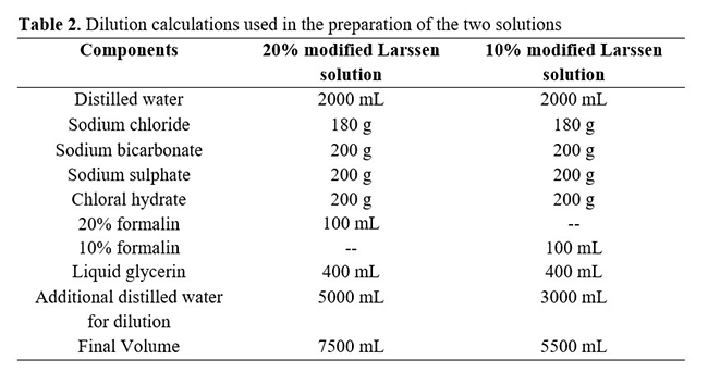The addition of 5000 mL of distilled water in the 20% modified Larssen solution had an experimental criterion of obtaining a higher yield of the new solution as compared to the original formulation. However, in order to retain its conservative characteristic, it was decided to increase the formalin concentration (20%) (Table 2).
