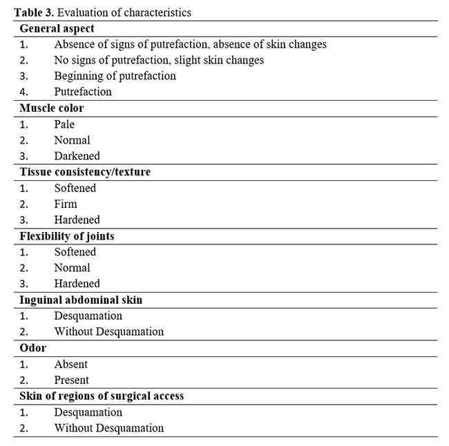 The parameters most similar to living tissue were considered normal. The tissue texture classification was performed after excision and suturing. The joint flexibility was measured by flexing the thoracic and pelvic limbs of the corpse in lateral decubitus position (Table 3). Statistical analysis was based on the chi-square test at a 5% level of significance.