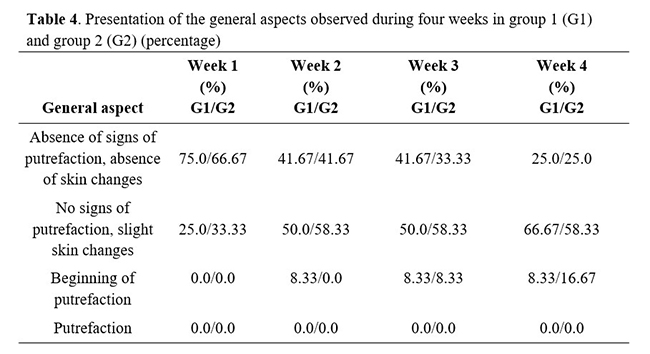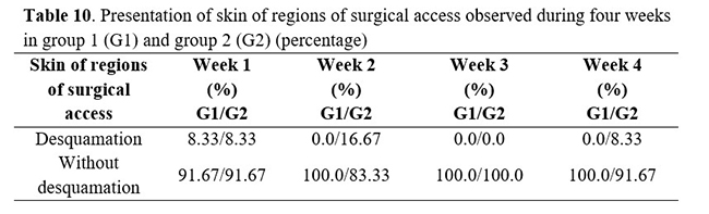 Skin scaling affecting the lateral surface of the thorax was documented in one G1 cadaver in the first week of the experimental period; however, no scaling occurred in other areas submitted to surgical procedures over the course of the following weeks. In G2, three cadavers developed skin scaling: one in the first and fourth week and two in the second week (Table 10).