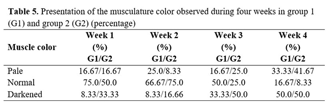 Muscle tissue discoloration was the most significant macroscopic finding in this study, with six cadavers in each group showing darker muscle tissues in the fourth week of the experimental period (Table 5).