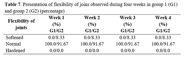 No changes in tissue texture/consistency or tissue/joint flexibility were noted in G1 cadavers; however, one G2 cadaver showed softer tissues and joints than normal since the first week (Tables 6 and 7).