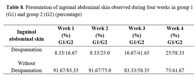 Abdominal and inguinal skin scaling were the second most relevant macroscopic changes in the cadavers analyzed, affecting three G1 and seven G2 cadavers. Changes occurred at the end of the experimental period (Table 8).