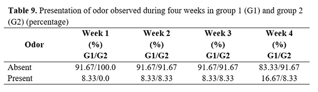 Foul odor was noted in one G1 cadaver right from the beginning, and in the last week of the experimental period in another. One G2 cadaver developed foul odor from the second week (Table 9).