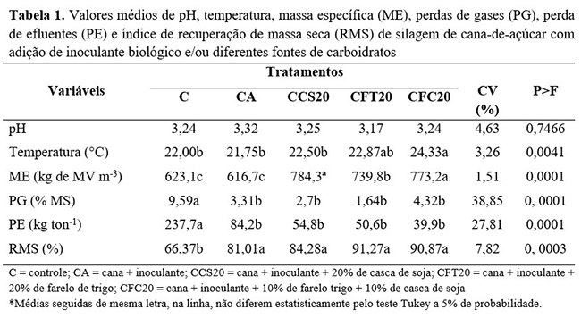 Os valores da massa específica (ME) variaram de acordo com os tratamentos, sendo observados valores maiores nas silagens em que foram adicionadas fontes de carboidratos juntamente com o inoculante biológico, em comparação com a silagem controle ou apenas com inoculante bacteriano (Tabela 1). Tais resultados são provenientes da elevação do teor de matéria seca(6) e da facilidade de compactação do material ensilado que a adição de fontes de carboidratos pode causar, resultando em uma maior quantidade de MS de silagem por unidade de volume.