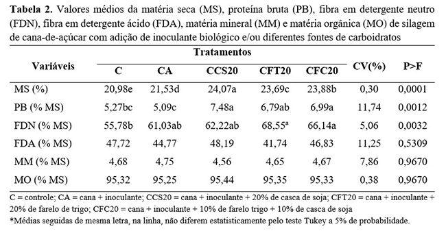 Quanto às variáveis matéria mineral e matéria orgânica, não foram observadas diferenças significativas entre os tratamentos (Tabela 2), indicando que a adição de inoculante biológico e/ou fontes de carboidratos não foi suficiente para influenciar tais características na silagem de cana-de-açúcar.