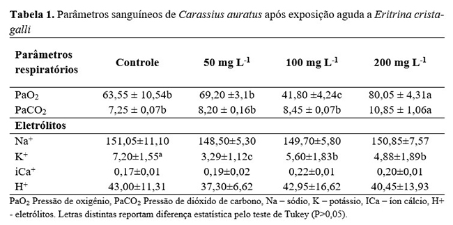A tolerância dos peixes foi aferida pela sobrevivência às concentrações testadas a cada hora durante as seis primeiras horas do ensaio, posteriormente com intervalos de seis horas até 24 horas de exposição, e diariamente até 96h. Após o período de exposição à Erythrina crista-galli, todos os peixes de cada aquário foram rapidamente contados e capturados para coleta de sangue, com seringa de três mL heparinizada pela veia caudal, e coleta das brânquias. O sangue foi analisado em aparelho de hemogasometria (Cobas HB121 – Roche Diagnóstica Brasil, São Paulo, SP, Brasil). Foram mensurados os íons Sódio (Na+), Potássio (K+), Cloreto (Cl+) e Cálcio (Ca2+). Foram também determinados parâmetros respiratórios no sangue de pH, H+, concentração de bicarbonato (HCO-3), pressão parcial de oxigênio (PaO2) e pressão parcial de dióxido de carbono (PaCO2).