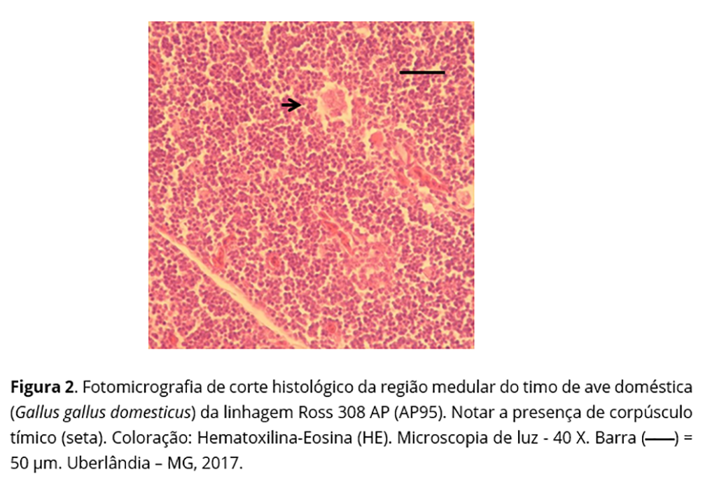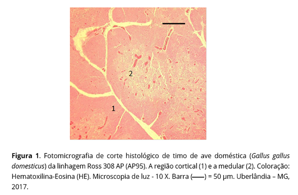 A exploração zootécnica impulsiona a intensa seleção genética, com o objetivo de desenvolver animais com maior produtividade e rusticidade, ou seja, capazes de produzirem bem, mesmo quando submetidos a condições adversas. Portanto, as adaptações morfofisiológicas são essenciais para o desenvolvimento de linhagens de aves mais resistentes. Tais adaptações geram variações anatômicas e, por conseguinte, justificam as diversas pesquisas morfológicas(2); dentre elas, aquelas referentes aos órgãos ligados à defesa do organismo, por exemplo, o timo, importante órgão linfoide, cujo estudo é prioridade em diversos grupos de pesquisas em aves.