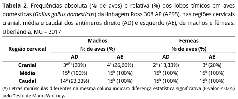 Tomando-se como base o comprimento total do pescoço de cada ave e subdividindo-o em três regiões (cranial, média e caudal) de tamanhos iguais, verificou-se que a ocorrência de lobos tímicos no terço mais cranial é menor, quando comparada aos terços médio e caudal(20).
