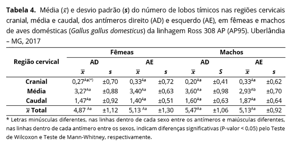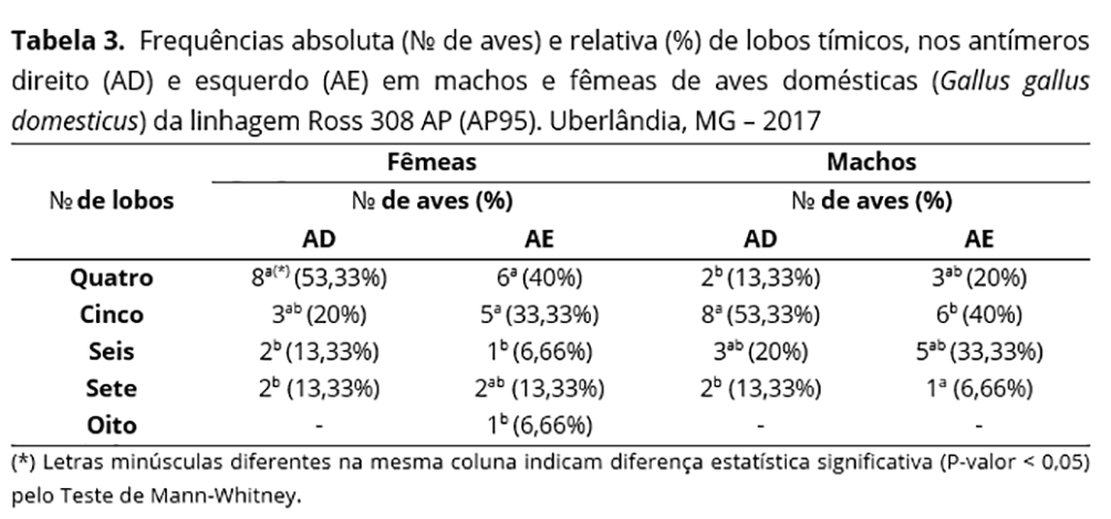 Em aves da linhagem Bovans Goldline, descreveu-se de dois a seis, com predomínio de cinco e três lobos, para os antímeros direito e esquerdo, respectivamente(24); nas aves Paraíso Pedrês, o número variou de dois a 10 lobos para o antímero esquerdo e de três a oito lobos para o antímero direito, não ocorrendo diferença estatística significante para os dados correlacionados entre machos e fêmeas(17); em Hubbard, o número de lobos oscilou de três a treze(14); para aves Master Gris Cou Plumé encontrou-se de quatro a 11 lobos tímicos, por antímero(25); uma variação de três a cinco lobos foi constatada em aves reprodutoras pesadas Cobb, com idades entre cinco e seis semanas(23). Por fim, em galinhas caipiras, o número de lobos tímicos descritos foi de quatro a oito por antímero(26), os dados obtidos no presente estudo corroboram com estes últimos dados.