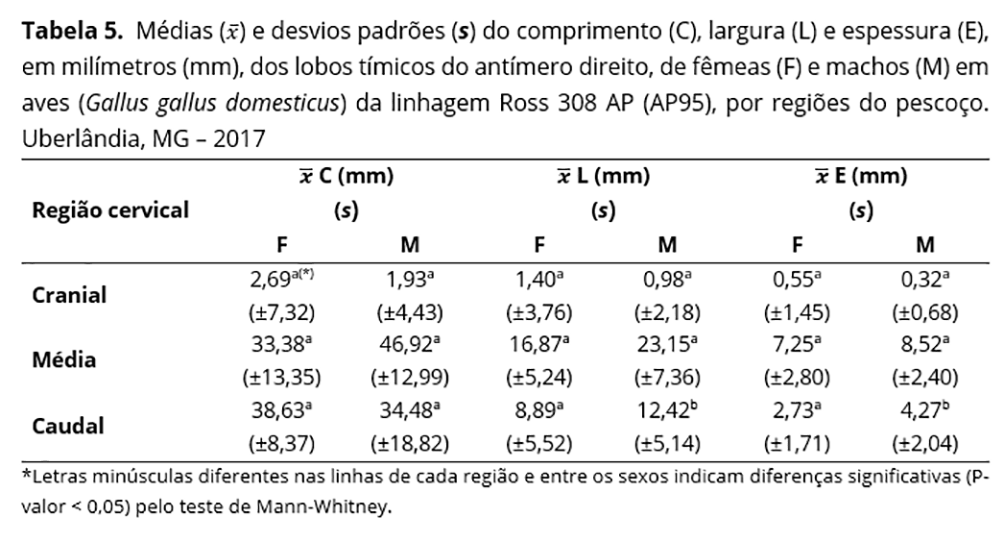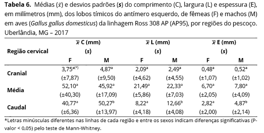 As medidas médias das dimensões dos lobos tímicos de ambos os antímeros indicaram diferenças significativas entre machos e fêmeas na região caudal do pescoço. Nos antímeros direito e esquerdo, as diferenças foram observadas em relação à largura e à espessura, além disso, no esquerdo constatou-se também quanto ao comprimento (Tabelas 5 e 6).