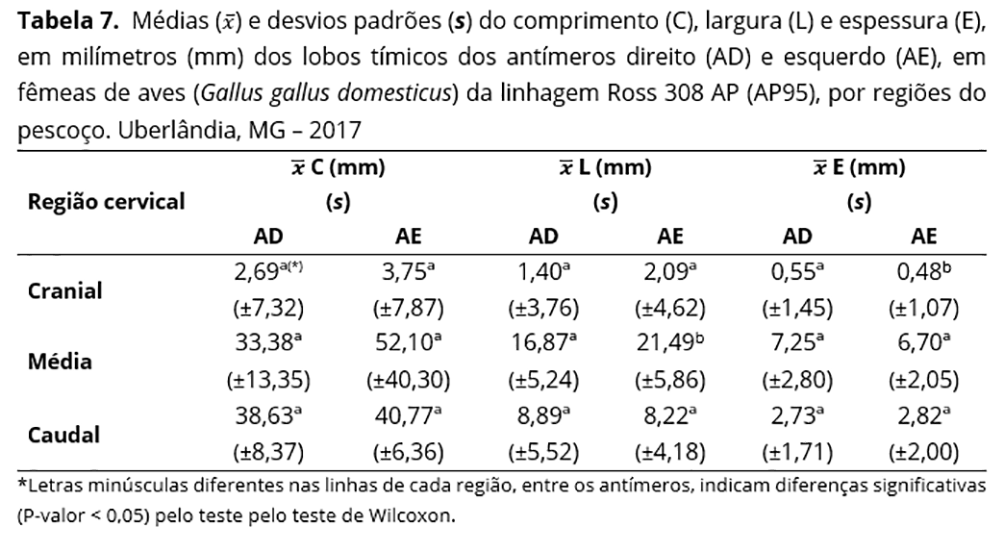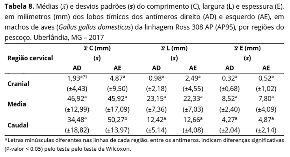 Levando-se em consideração as regiões do pescoço, comparou-se as médias de cada dimensão dos lobos entre os antímeros direito e esquerdo, em aves do mesmo sexo. Em fêmeas, detectaram-se diferenças quanto à largura e espessura, nas regiões cervicais média e cranial, respectivamente. Nos machos, foram notadas na região caudal, em relação ao comprimento (Tabelas 7 e 8).