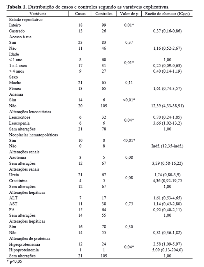 Para o estudo dos fatores de risco, os prontuários clínicos dos animais foram consultados para obtenção de dados referentes às variáveis biológicas, hábitos comportamentais e clínicos. As variáveis biológicas coletadas e suas respectivas categorias foram: idade (menor de um ano, entre um e quatro anos e maior de quatro anos), sexo (macho/fêmea) e estado reprodutivo (esterilizado/não esterilizado). Optou-se por dividir os animais nas faixas etárias acima mencionadas, de forma semelhante a outros estudos epidemiológicos realizados no Brasil(7,8). A variável analisada relacionada aos hábitos comportamentais foi o acesso à rua (sim/não). Com relação aos dados clínicos, foram analisadas as variáveis hematológicas: anemia (hematócrito < 24%), não-anemia (hematócrito > 24%), leucocitose (leucócitos > 19.500 células/mm3), leucopenia (leucócitos < 5.500 células/mm3), hiperproteinemia (proteína plasmática total > 8g/dL), hipoproteinemia (proteína plasmática total < 6g/dL), azotemia (ureia > 60 mg/dL, creatinina > 1,8 mg/dL) e aumento de enzimas hepáticas [Alanina aminotransferase (ALT) > 90 UI/L, Aspartato aminotransferase (AST) > 80 mg/dL e Fosfatase alcalina (FA) > 288 UI/L] e a variável neoplasia hematopoiética [presença ou ausência de neoplasia hematopoiética (linfoma ou leucemia)].