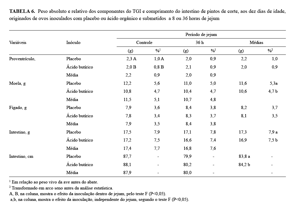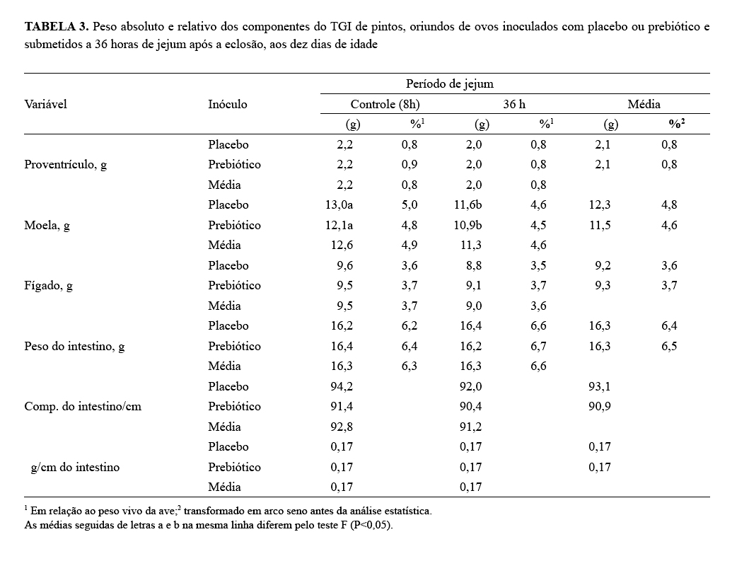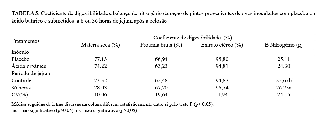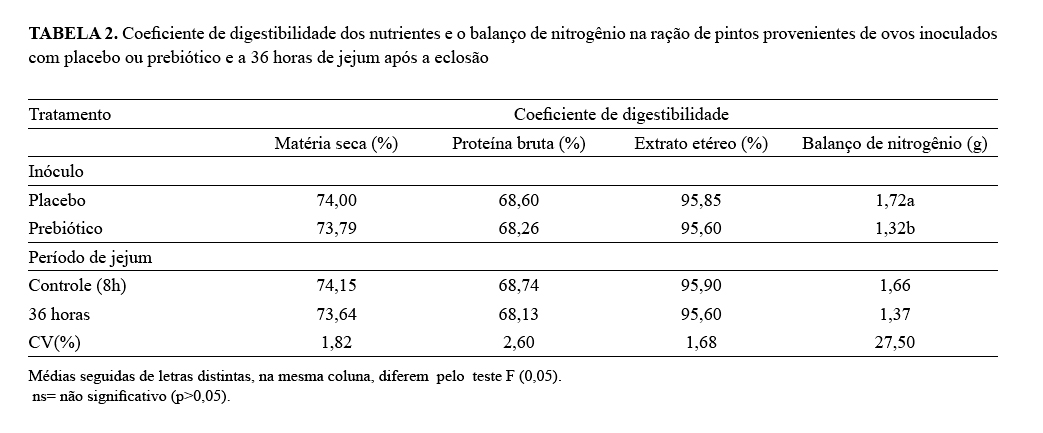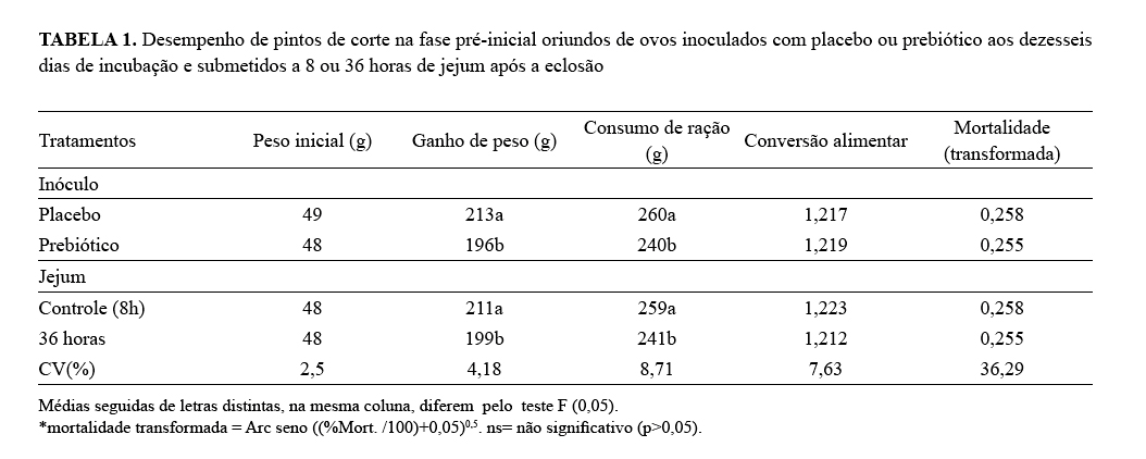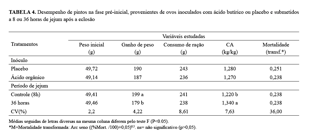 ovos inoculados com prebiótico ou ácido orgânico, submetidos a jejum