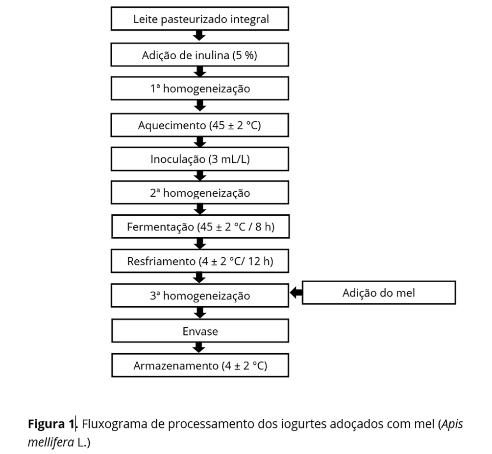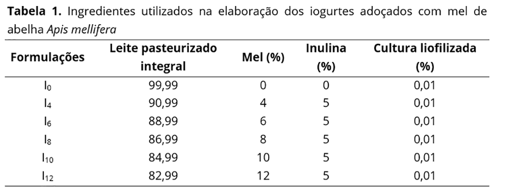 Para elaboração dos iogurtes, foram utilizados leite pasteurizado integral comercial, inulina (INIFLORA 99%), mel de abelha Apis mellifera L. e cultura láctea liofilizada (SACCO – Lyosfast®), composta por Streptococcus salivarius subsp. thermophilus e Lactobacillus delbruekii subsp. bulgaricus.