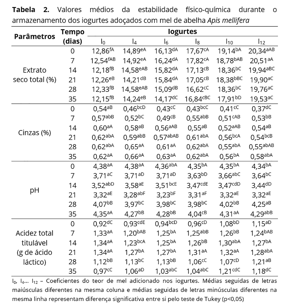 Na Tabela 2 estão apresentados os resultados da estabilidade físico-química dos iogurtes adoçados com mel de abelha Apis mellifera durante o armazenamento.