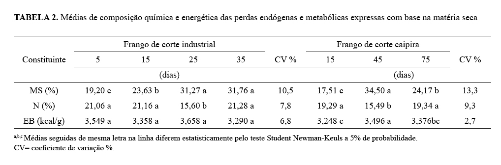 seca, nitrogênio e energia bruta das perdas endógenas e metabólicas das