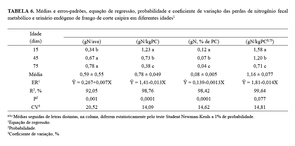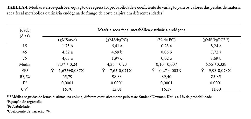 perdas endógenas e metabólicas. Foram determinados os teores de matéria