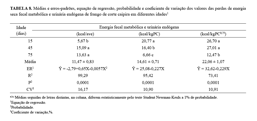 PALAVRAS-CHAVES: Aves em jejum, método de coleta total, energia fecal metabólica, energia urinária endógena.