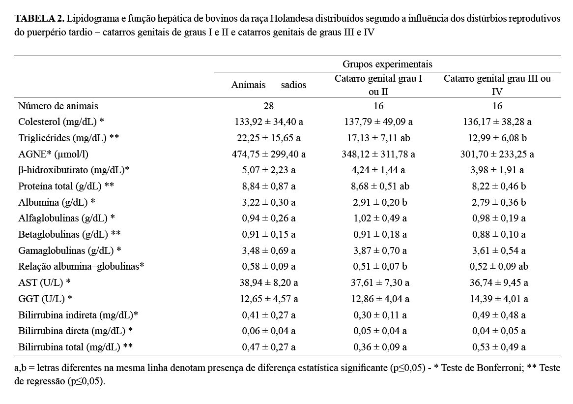 soro sanguíneo de bovinos da raça Holandesa. A função hepática foi